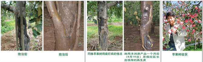 2008年7月15日,通过施用沣润源病害专用型产品及其特殊处理方法,2008年9月16日经对处理后的苹果树恢复情况可以看出:在病灶的树杆处已经能够清楚的看出有健康的树皮组织正在茁壮生长,苹果腐烂病得到了根治。2010年经国内权威部门检测,沣润源产品生产的苹果品种优异,且各项有害物质及农药残留均未检出。施用沣润源的苹果园均获得了高产,用其生产出的苹果果色均匀,甜、脆、水分多,深受消费者的喜爱。由于沣润源产品生产出的苹果SOD含量高达58.71,普通苹果仅卖1元多,而施用沣润源苹果每斤的售价高达3元。