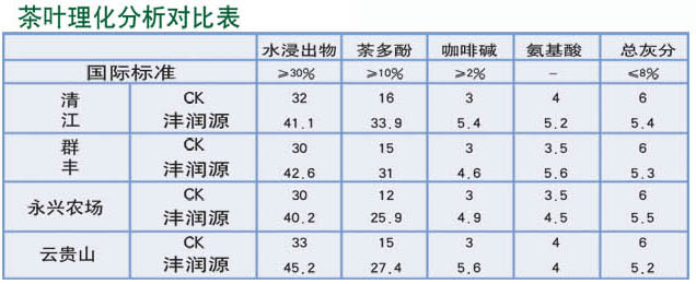 2010年公司在贵州省茶叶事业局的引荐下,在贵州省湄潭县的清江、群丰、永兴茶场和云贵山(土壤属酸性黄壤土)四个地方开展了施用沣润源产品及技术茶叶示范种植,2010年6月4日经贵州省茶叶研究所对茶叶品质检验表明,其各项检测指标均优于同类产品。茶叶理化分析见表: