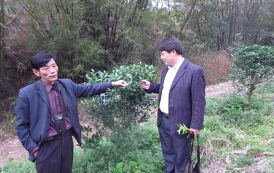 图为岁岁红柑橘协会会长肖文潮(左)向张总介绍运用沣润源产品在惠州市龙华县柑橘黄化、黄龙病防治方面效果十分明显