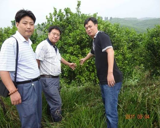 图为沙塘桔协会黄超文会长(中)向张总(左一)介绍在四会市地豆镇施用沣润源柑橘土壤调理专用型产品,柑橘黄龙、黄化病得到有效抑制的情况